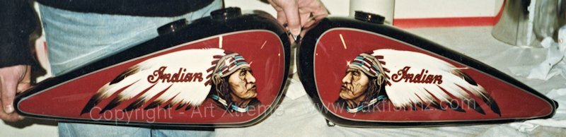 Photo below: 1930's Indian motorcycle tanks with custom design airbrushed insignia logo 1998.